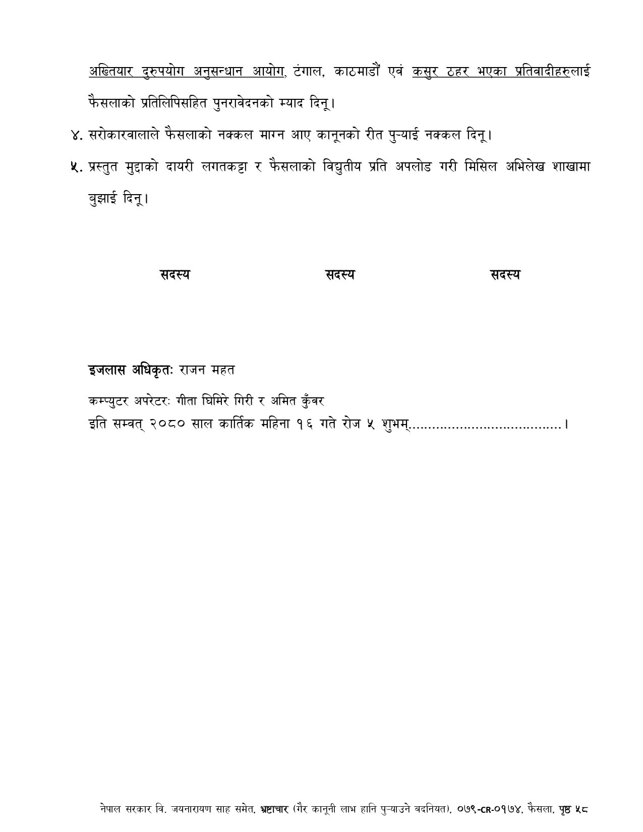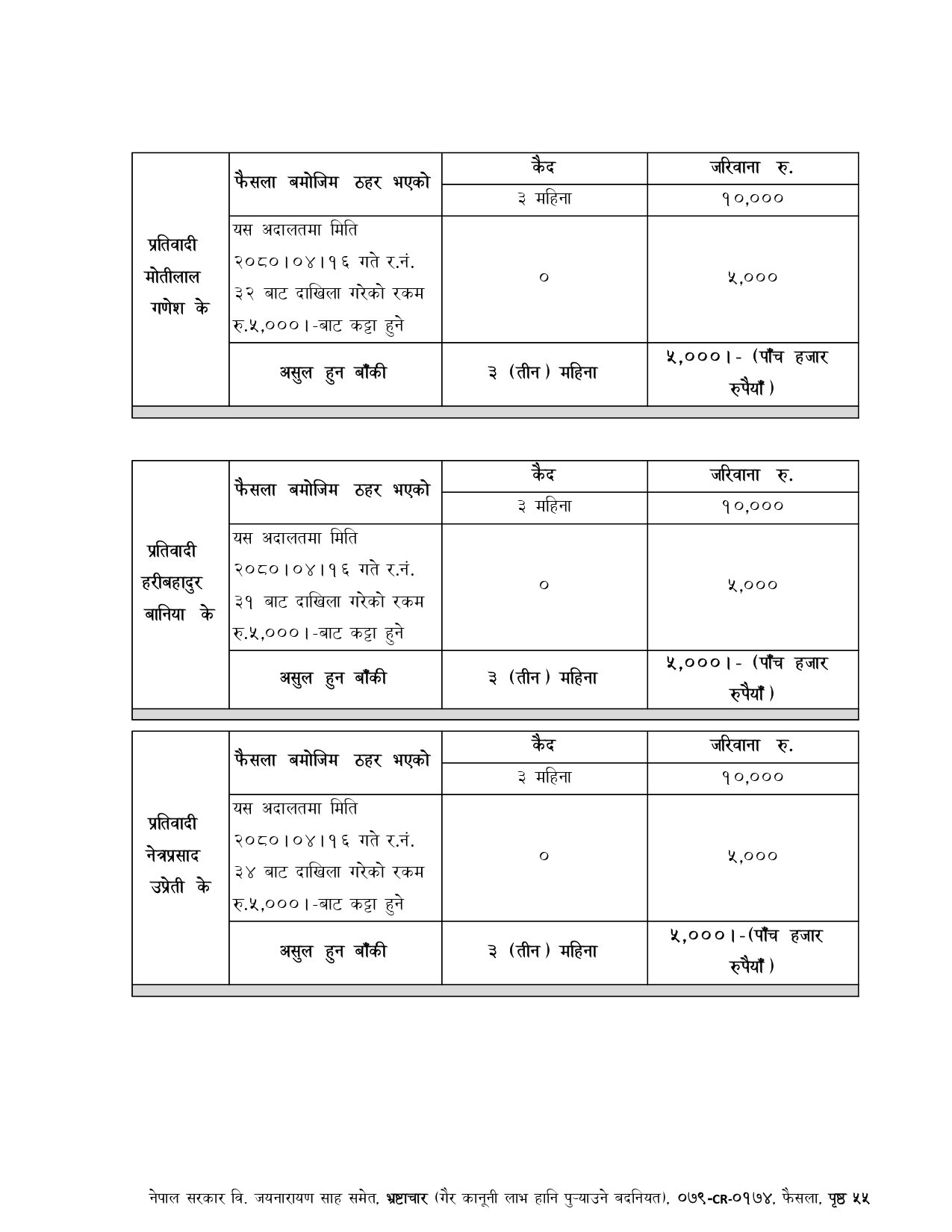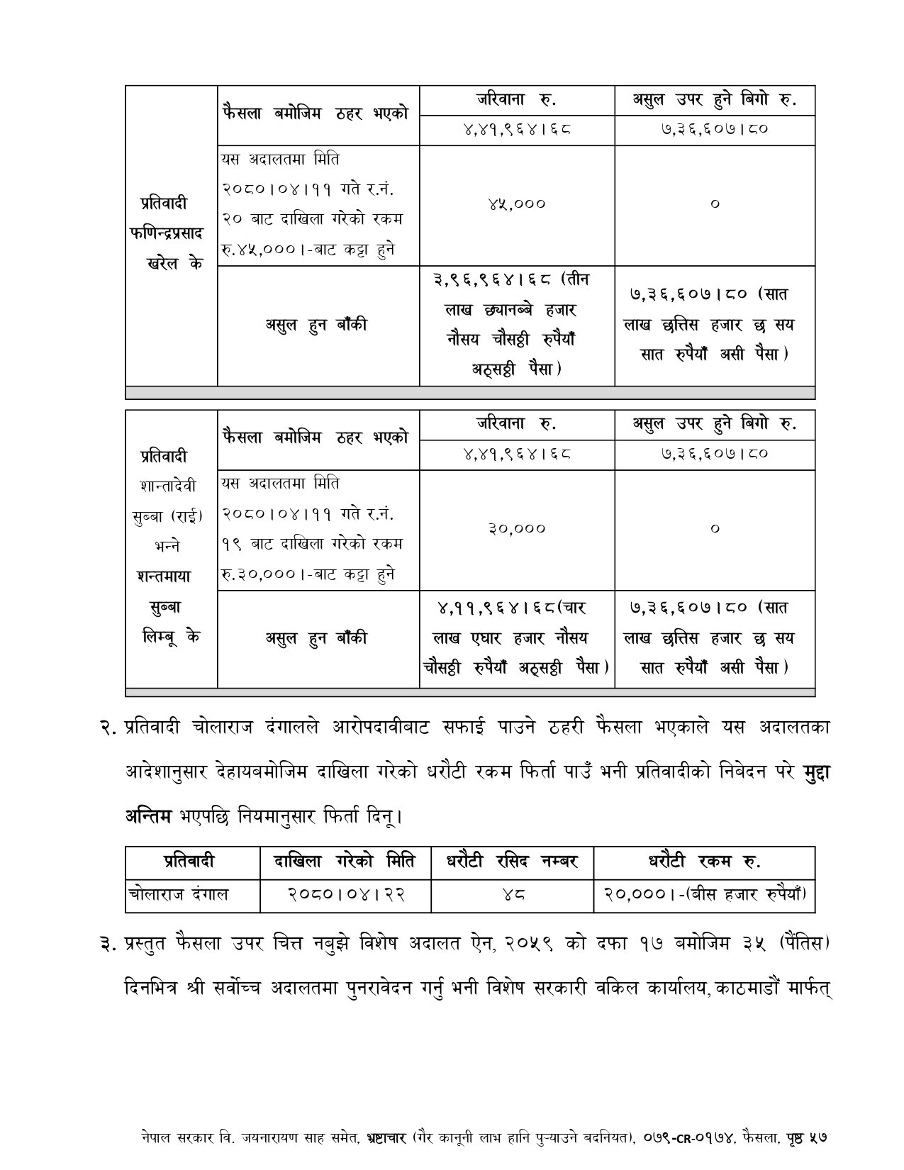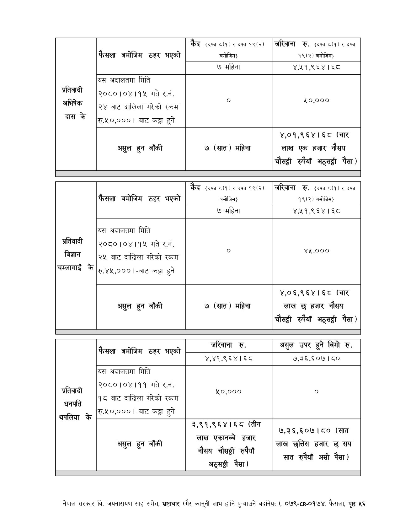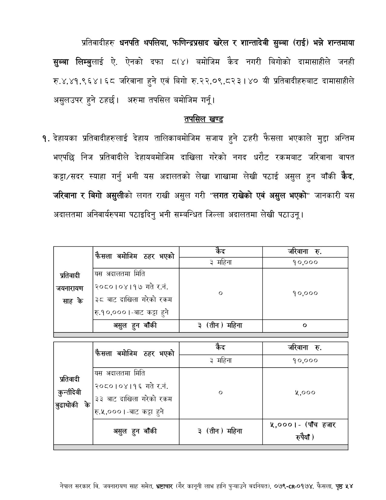 झापा- झापा गाउँपालिकाका अध्यक्ष जय नारायण साह, तत्कालीन उपाध्यक्ष कुन्ती देवी बुढाथोकी, प्रमुख प्रशासकीय अधिकृत, वडा अध्यक्ष, उपभोक्ता समितिका अध्यक्षसमेत ११ जना उपर गैरकानूनी लाभ तथा हानी पुर्याई भ्रष्टाचार गरेको भन्दै अख्तियार दुरुपयोग अनुशन्धान आयोग काठमान्डौले बिशेस अदालतमा दायर गरेको मुद्दाको फैसलाको पूर्ण पाठ आएको छ ।