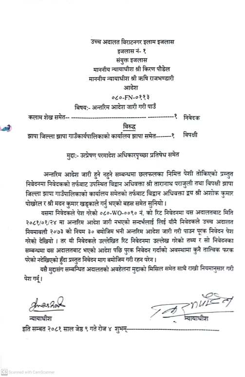झापा गाउँपालिकाको निर्णय कार्यान्वयन नगर्न उच्च अदालतको अल्पकालिन अन्तरिम आदेश